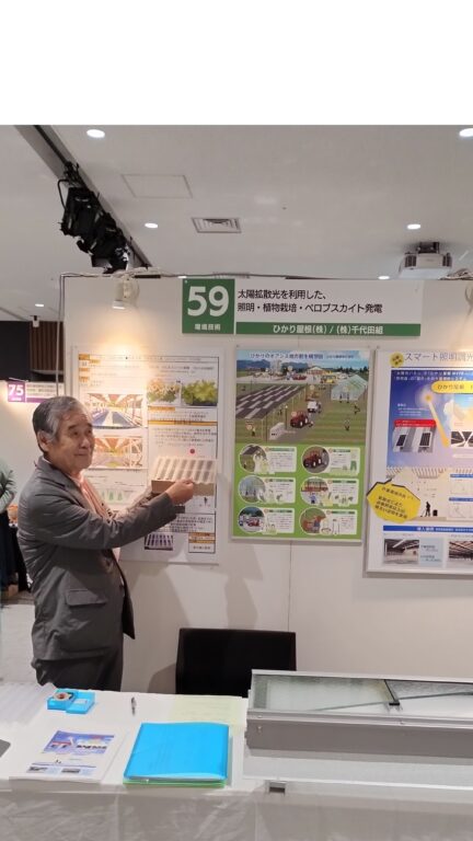 弊社は特許出願中の「カゲテラス®」ペロブスカイト発電と植物栽培などのパネル展示を中心にご来場者様に説明を行いました。特に研究開発の分野のお仕事をなさっている方たちとの交流はとても有意義なものでした。展示会の主催者である(公財)大田区産業振興協会様に感謝しております。有難うございました。