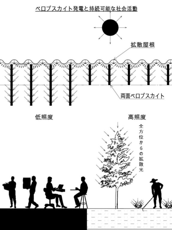 展示パネルにて説明した特許出願中のペロブスカイト発電関連 新技術(図は説明図)。